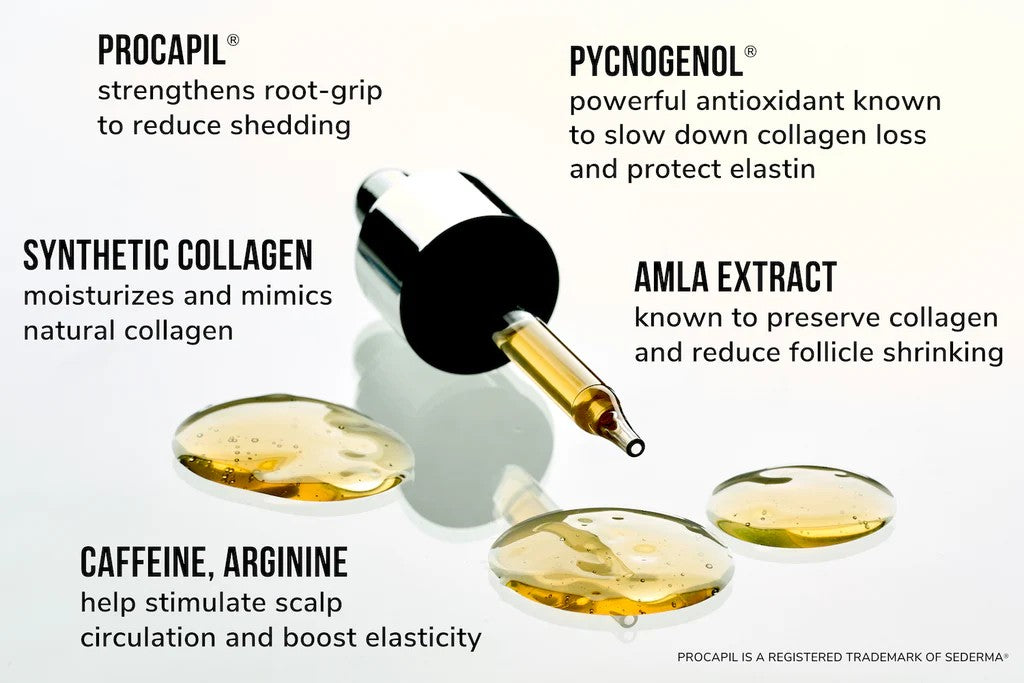 As scalp collagen degrades (from chronological aging or free radical damage) hair follicles shrink and become rigid, and the strands being produced become finer, brittle, less supple and resilient. Also, the follicles’ grasp on strands is weakened, leading to increased shedding and hair thinning. Youth Juice helps preserve, protect and promote collagen to keep your hair thick, strong, in its prime!